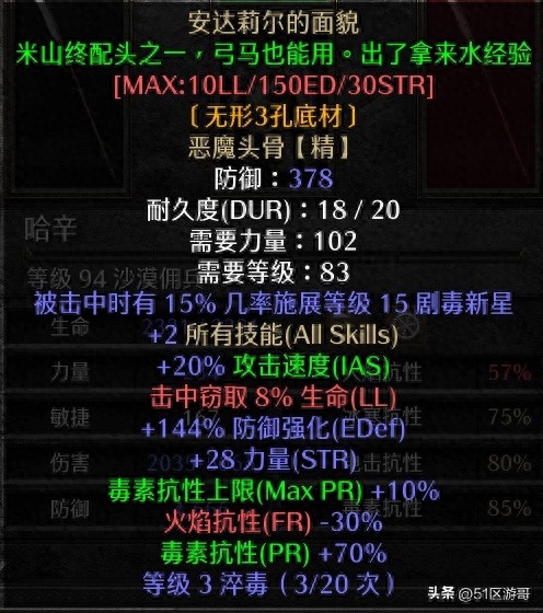 3、头盔:安达利尔的脸,所有技能加2,攻击速度加20%,生命偷取8%,最大力量加成30点。最好改成隐形。