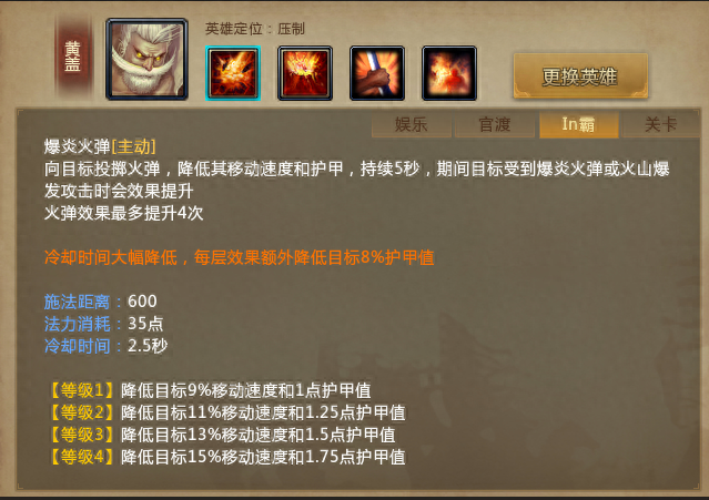 黄盖一技能引爆烟火弹。这是一个单目标技能。该效果最多可叠加4次。追捕敌人的魔法技能。黄盖的技能爆发出火焰弹。这是一种单向技术。该效果最多可叠加4次。狩猎敌人的魔法技能。