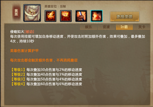 黄盖的终极攻击如火。这也是一个被动技能。每次使用技能时,普通攻击都会叠加伤害,移动速度也会增加。它对建筑物也有效。黄盖的杀招是“袭如火”。这也是一个被动技能。每次使用技能时,你的普通攻击都会受到伤害,并且你的移动速度会增加。对建筑物也有效。