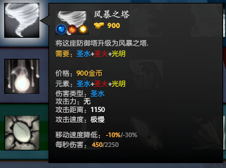 风暴塔:前期很好用,后期需要升级。和元素TD里带减速效果的塔一样,不过这个范围的AOE伤害还可以。
