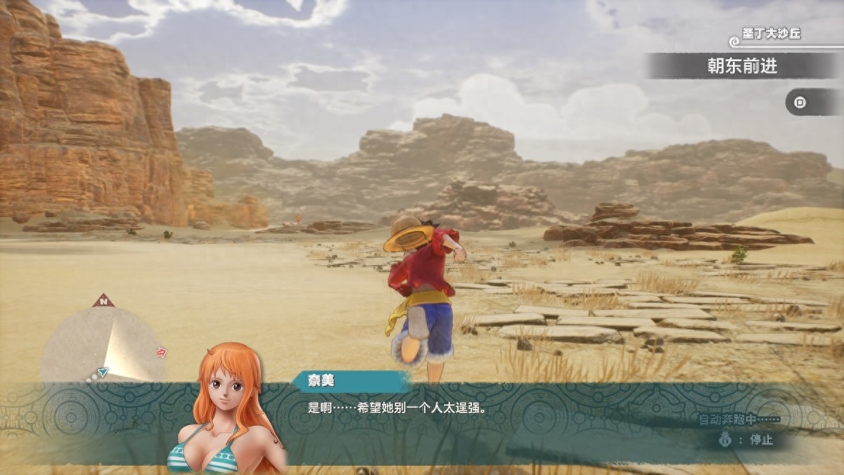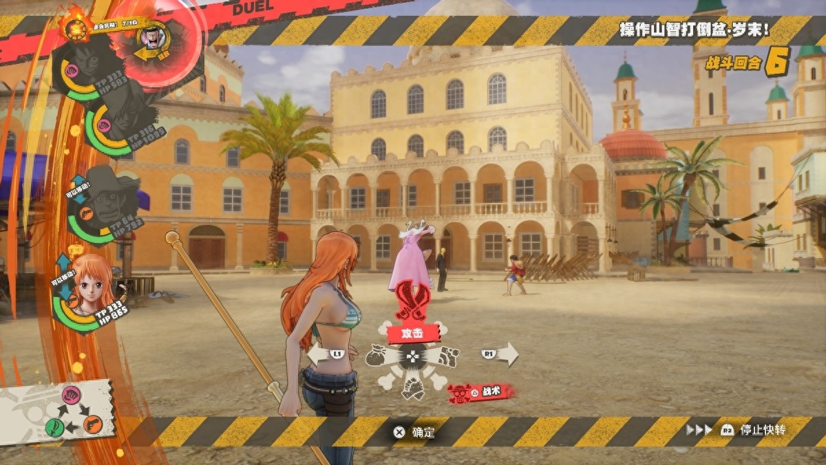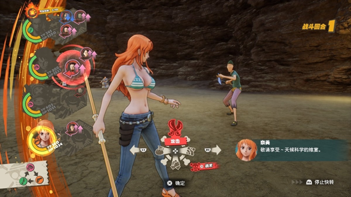 从玩法上来说,时空诗整体来说并没有太大的问题,但是有一点会影响玩家在游戏中的体验。游戏中,路飞一行人将会有探索技能的设定。利用不同角色的探索技能寻找场景中的特定物品,完成场景的探索。例如,娜美可以在现场找到有价值的道具,沃布可以用弹弓射燕窝,山治可以找到珍贵的烹饪食材。但在这部分体验中,需要频繁的停顿来在受控角色之间进行切换。按十字键的左右键不能立即切换,会影响整个游戏过程的流畅性。