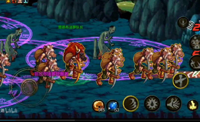 这个房间里有很多怪物,包括布法罗船长和12个小怪,但我们不需要杀死所有怪物。只要杀死水牛队长,小怪就会进入狂暴状态,一定时间后自动消失,所以整体难度不高。需要注意的是,紫色圆圈内的怪物无法受到伤害。进入画面后,可以将怪物引到右下角的空位处将其击杀。