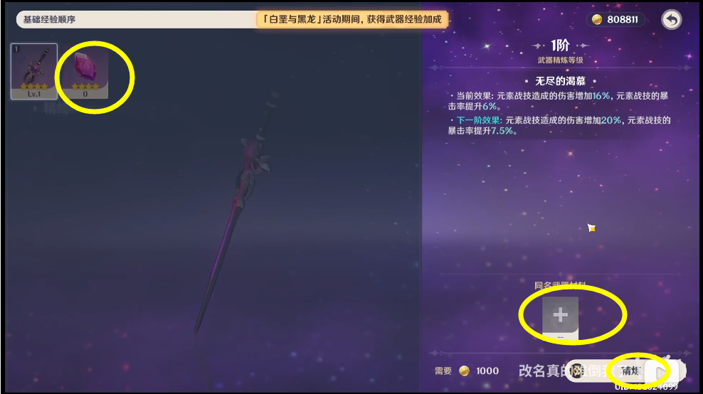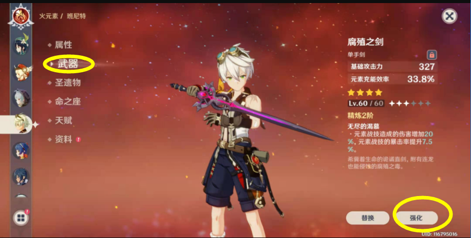 4。打开佩戴腐殖质之剑的角色,点击武器,点击强化;