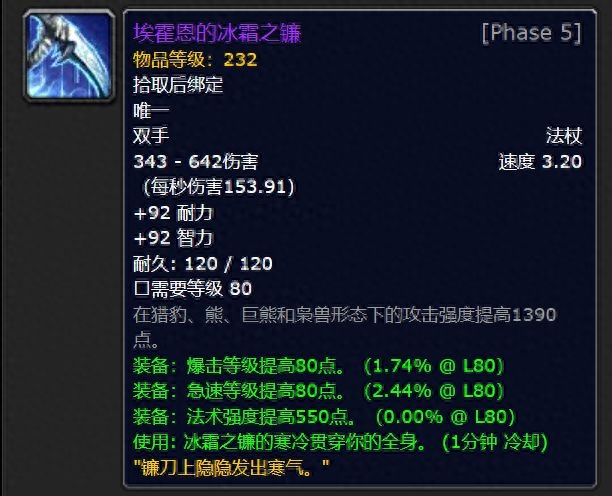 这些紫色中最著名的是艾霍恩的冰霜镰刀。这是232级的法杖,性能出色,外观也非常漂亮。对于80级的法系玩家来说是一把非常好的武器。提高快速暴击等级和法术强度,是早期武装小号的必备装备!