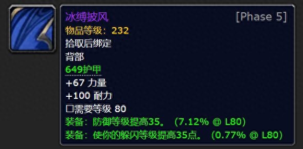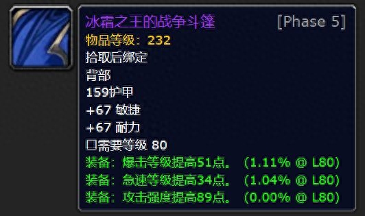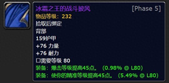 力量披风名为【冰霜王战斗披风】,增加主属性力量和暴击命中精度等级。是战士DK和惩戒骑手的绝佳装备。
