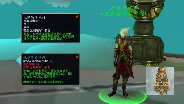 龙眠联盟军需官位于古龙荒野的龙眠寺顶楼。声望友好时可以购买龙眠联军袍,声望尊重后可以购买头部结界【祝福疗愈秘药】,可以邮寄给Battle.net上的其他角色.