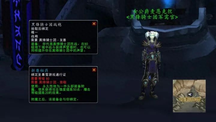 黑锋骑士团军需官位于冰山冰川的暗影拱顶。声望友好时可以购买黑锋骑士团,声望受尊重后可以购买头部结界【拷问秘药】,也可以邮寄给Battle.net的其他人物..