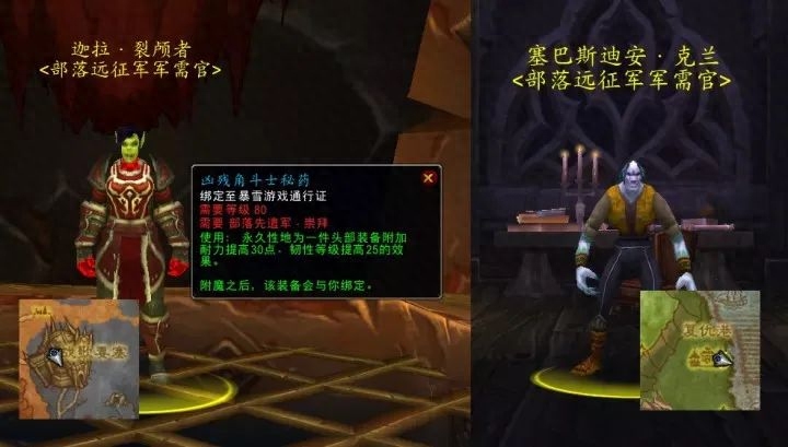 部落先遣军有两个军需官,分别位于北风苔原的战歌要塞和嚎叫风峡湾的复仇港湾。不提供制服。声望崇拜后可以购买头部结界【凶残角斗士秘药】,也可以邮寄给Battle.net其他角色..