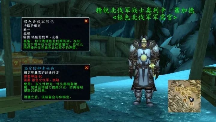 银色远征的军需官位于冰山冰川的银色前线基地。声望友好时可以购买【银色北伐军战袍】,声望受尊重后可以购买头部结界【坚定守卫者秘药】,也可以邮寄给战斗中的其他角色。网。
