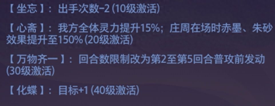 养成注:阵容核心是庄周和鬼谷子。前期产量主要靠鬼谷子,拍卖行能拿多少就拿多少。穆桂英根本不需要特意去买。只是一个临时的吊坠。如果条件允许,资金可以兑换五个庄周,轩辕从鬼谷回来后可以兑换张道陵。庄周解锁获得生命核心遗迹的武器后,所有资源都会投入到他身上。 20级会让全队毒力更高。庄周珪回归后,输出可以换成燕赤霞、王羲之等毒卡,奇铺就可以开始换钟馗了。拍卖行首先会以燕赤霞为主,其次是小无忧,等这些卡都准备好之后再考虑鲁班。另外,剑锋一天最多可以击中十二次,每天多击一击,就能帮助神明。