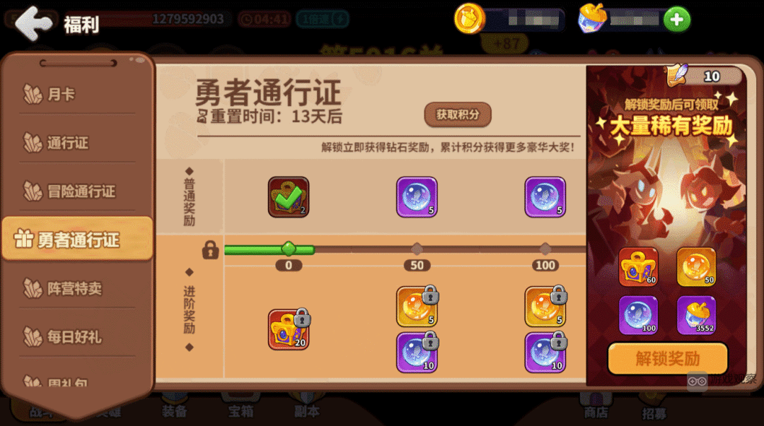 在主界面右上角,点击限时活动即可查看冒险通行证。积累积分以获得许多奖励。