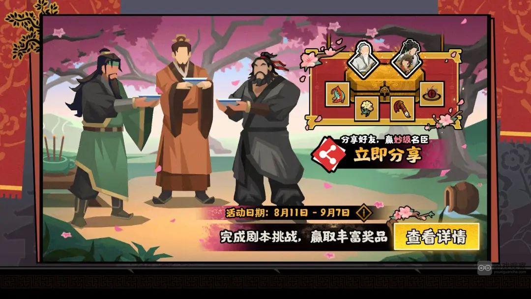 8月11日至9月7日,王者可以邀请好友完成剧本挑战,赢取丰厚奖品。其中,国王完成“助友游三国”活动后,可从2位名臣(薄亚子期或申)处获得1盒,完成“三国剧本挑战”活动后,可获得2支龙须笔*2。