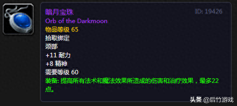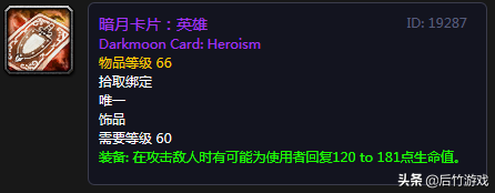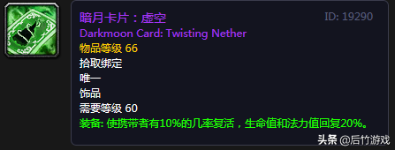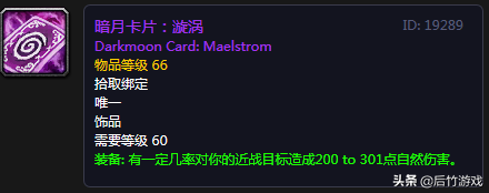 元素卡取代了暗月卡:大漩涡,这是一个输出饰品。有一定几率对你的近战目标造成200到301点自然伤害(暴击,伤害500+)。没有准确的概率数据,但个人感觉是放电,饰品的触发概率不如NAXX电锤。