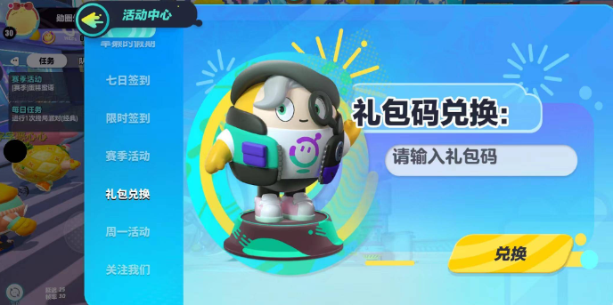 2.进入活动页面,选择【礼包兑换】,如下图箭头所示。上面输入兑换码即可获得福利。