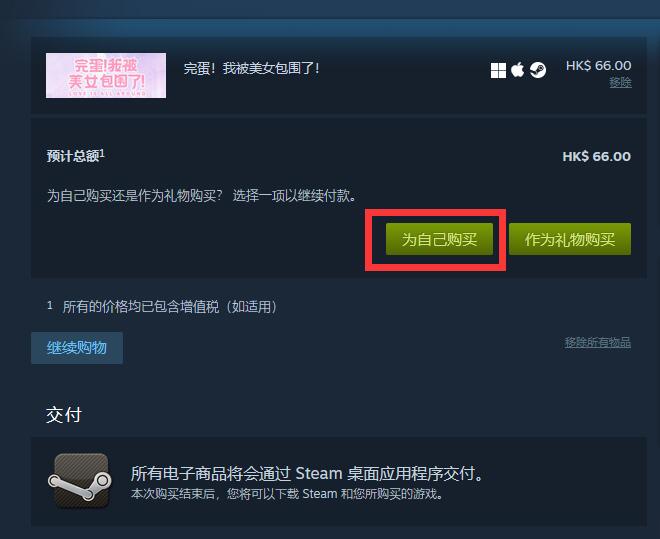 3.选择【自己购买】,完成支付,然后在steam中下载游戏。