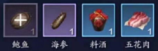 鲍鱼、海参、五花肉、料酒(粗体字为必备食材)