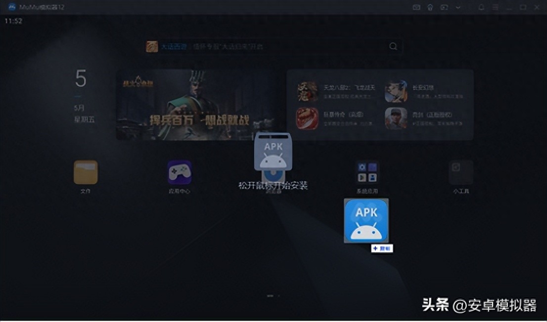 1. 将APK安装包拖放到模拟器中,然后松开鼠标进行安装。