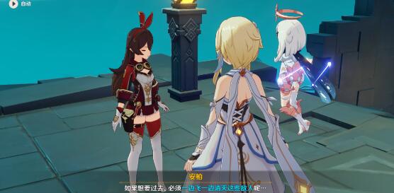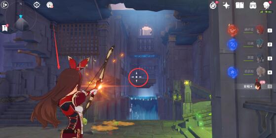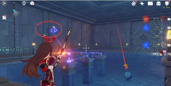 我们继续前进,使用房间中央的水下机构。使用琥珀弓和火元素蓄力攻击,摧毁左右两侧的机关。如果水位突然下降,可以使用机构开门。