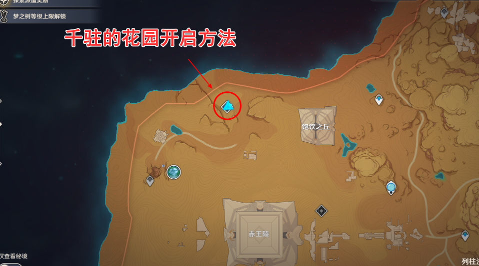 原神千驻的花园开启方法1。来到图中的位置,这里就是秘境【千竹花园】。
