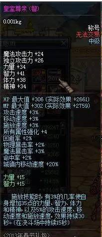 四维度+32,攻击、移动、施法速度+3%,全力+10,攻击力加成,299的礼包在当时还是非常划算的。攻击时有3%的几率使技能冷却时间减少30%,持续15秒,冷却30秒。