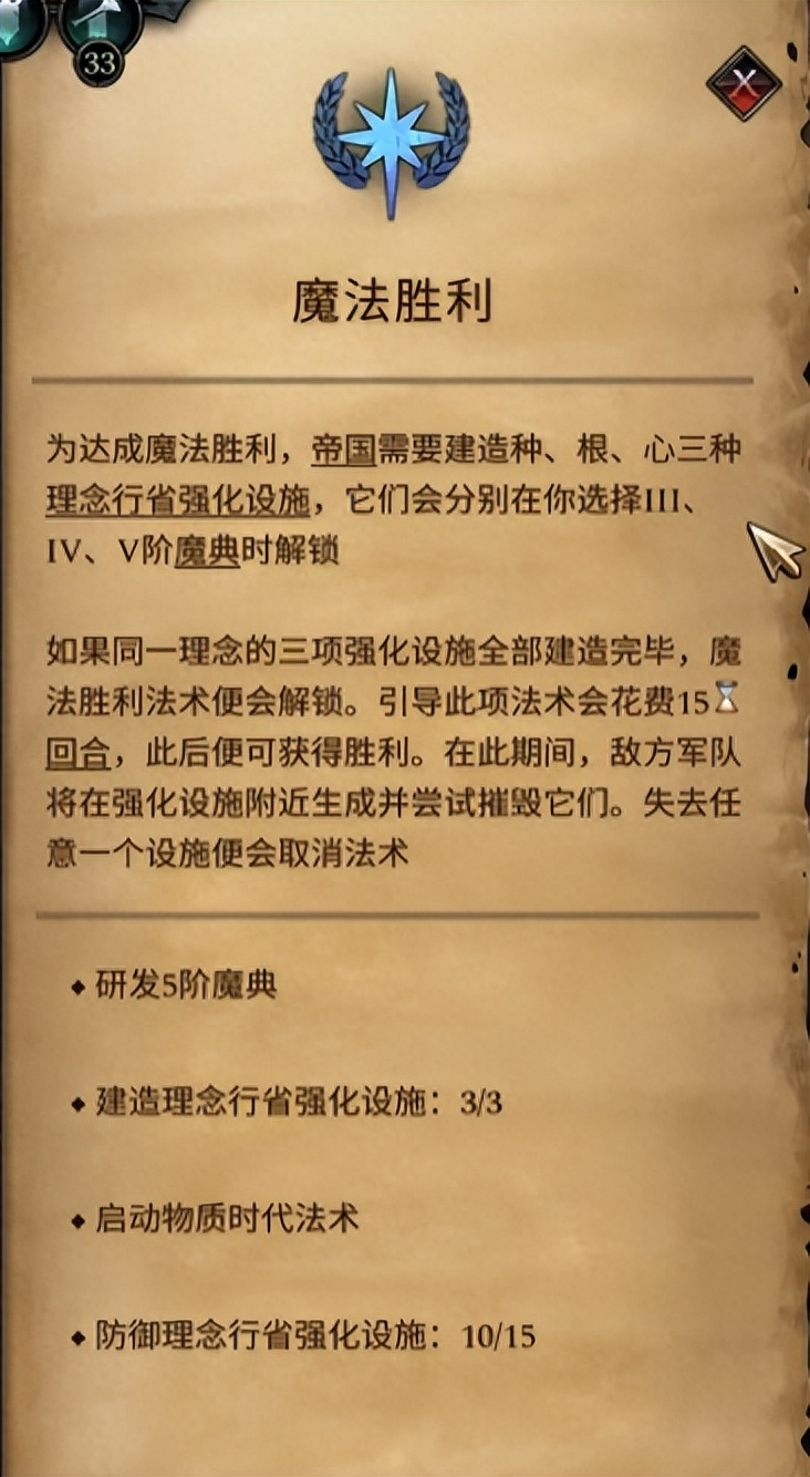 技术的胜利很容易理解。研究所有派系法术,建造派系的终极科学建筑,并持有这些建筑一定的回合数。在你魔法胜利的阶段,AI敌人会无缘无故地攻击你,甚至直接在你的建筑附近派兵。玩家所要做的就是抵抗一波又一波的攻击,直到最后的建筑完工。