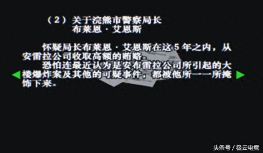 正当克莱尔准备离开办公室时,传真机突然收到了联邦调查局的内部调查报告。报道中写道:“克里斯雷德菲尔德,关于你所要求的情况,我们了解到以下有关调查结果的信息。首先,目前无法确定布雷拉某家公司是否正在研制‘G病毒’,未来调查还将继续进行;其次,关于浣熊市警察局长艾恩斯,根据调查,他涉嫌过去五年内接受布雷拉一家公司的高额贿赂,这与一系列事件有关一些事件被通过某种手段掩盖。人们还发现艾恩斯在大学里有性侵女生的历史。”