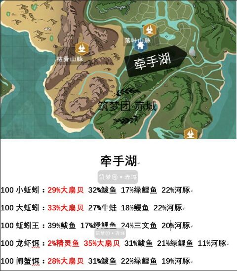 推荐在骷髅山右侧的千手湖附近钓鱼,这里的概率最高,达到32%。