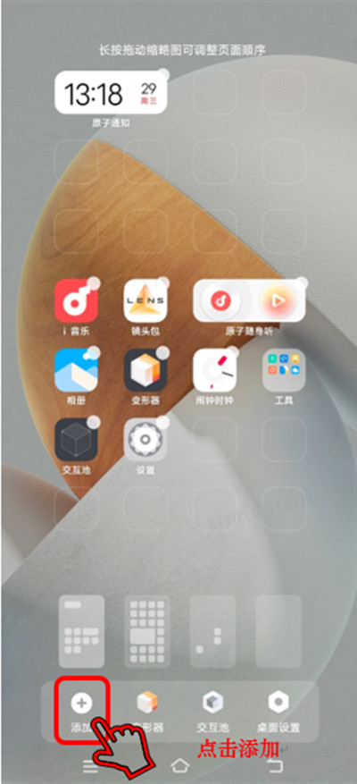 1、长按空白桌面进入桌面编辑状态,点击左下角【添加】。