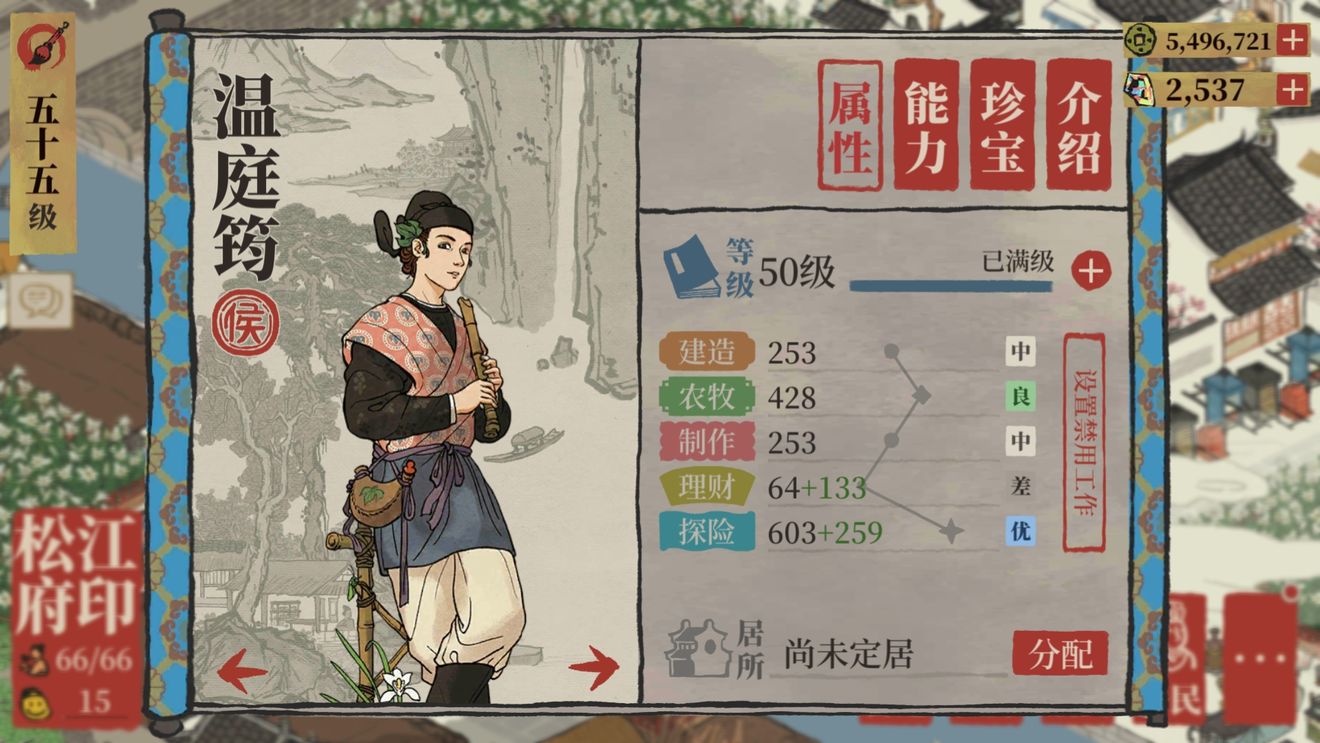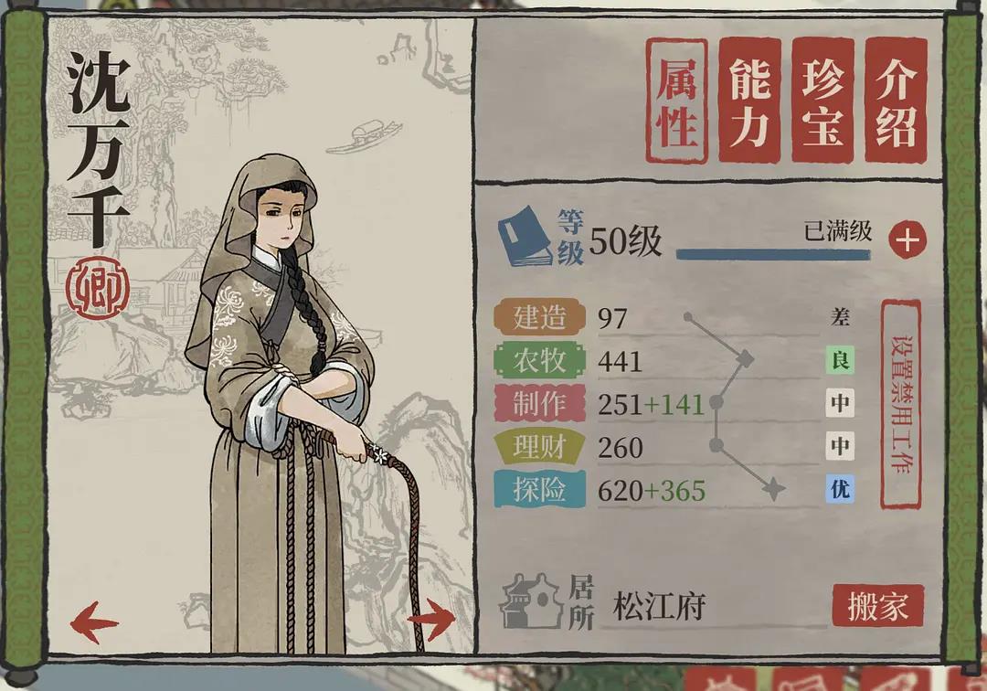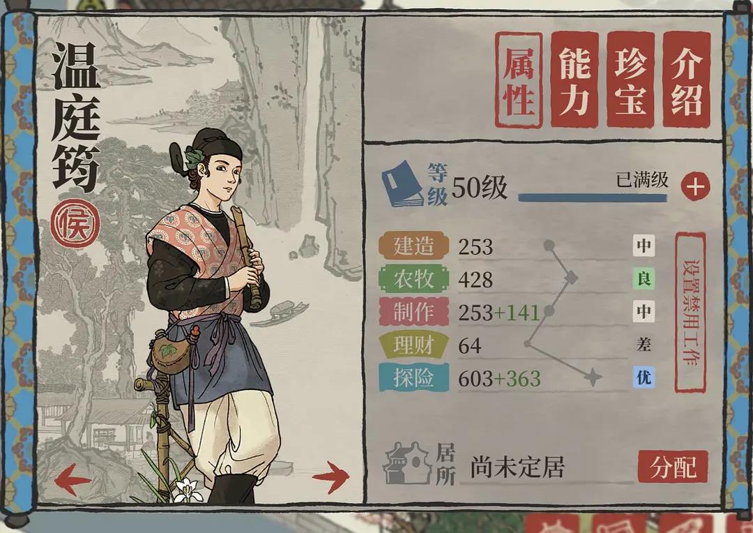 初始属性:建筑50,农牧71,生产50,财务管理15,探索256