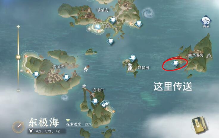 1、传送到东极海位置,如下图箭头所示;