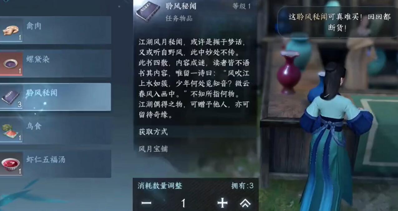 3.购买后,将叶子的秘密展示给文魁即可完成任务风月小姬。