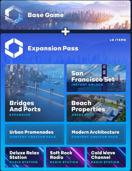 注:豪华版包括:旧金山包、海滩属性对象包、内容创建包x 2、Bridges Ports 扩展包、广播电台x 3