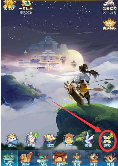 1.打开游戏进入首页,点击下图金色箭头所示的【更多】;