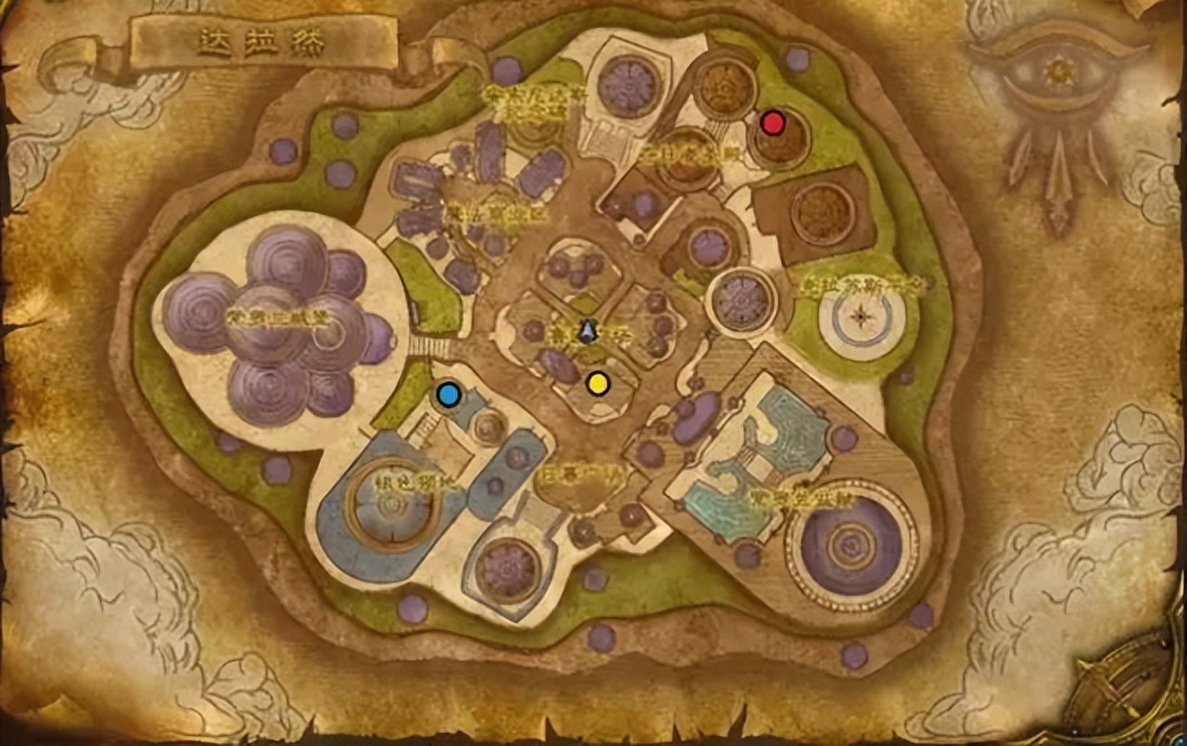 达拉然有三位传家宝商人。联盟正在白银领地寻找“附魔师伊森”(下图蓝色圆圈);部落正在Sun Raider Temple寻找“Erodin the Enchanter”(下图红圈);中性的“Bula”“Moss Well”(下图黄色圆圈)在摩尔的宝藏店里。