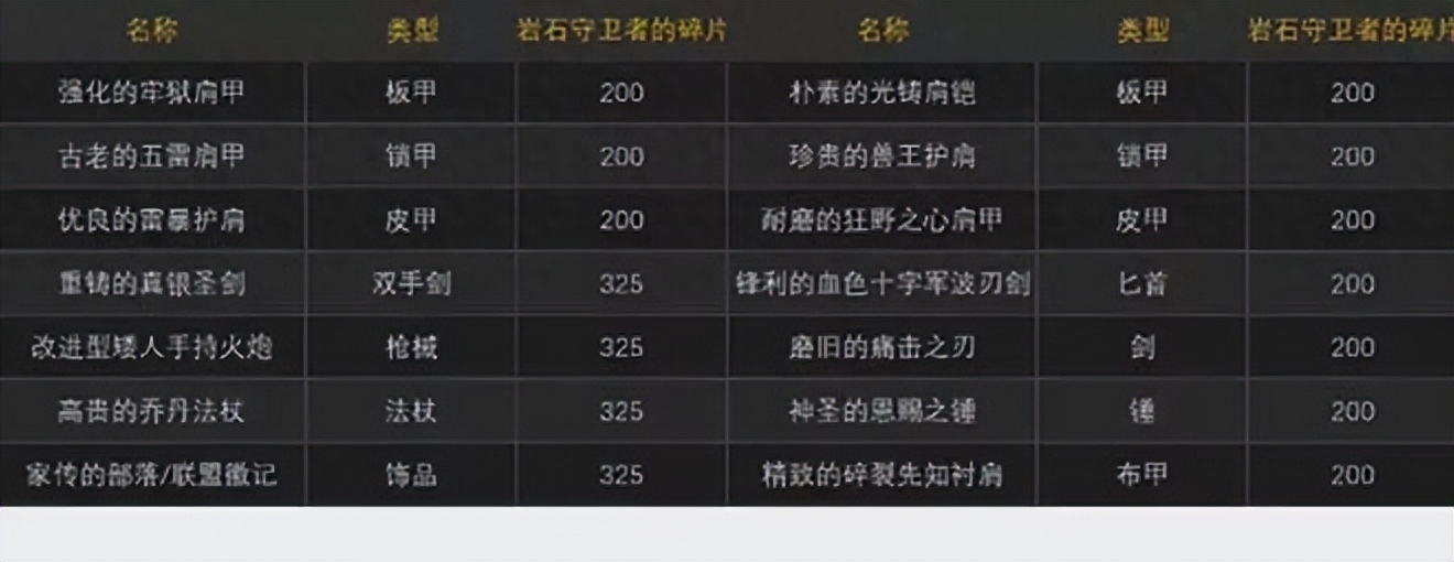 我们整理了可以兑换石守卫碎片的传家宝装备,如下表所示。