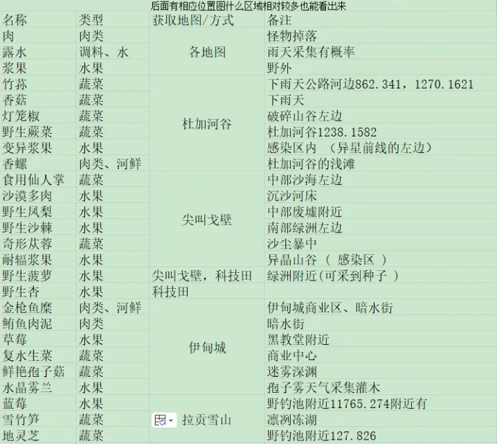 注:在伊甸城的商业区和暗水地点可以获得金枪鱼肉末,雨天可以收集到大量的露水。