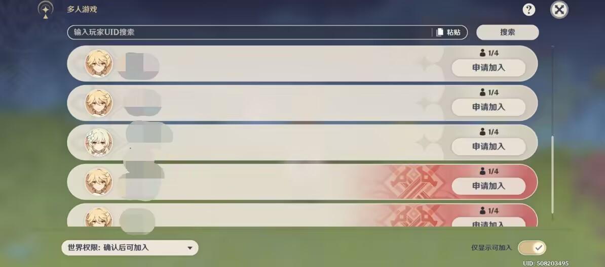 旅行者只能进入世界等级低于或等于自己的其他玩家的世界。在在线操作界面中,旅行者可以找到自己想要加入的世界,只需点击“申请加入”即可。但如果对方的世界设置为直接加入,则旅行者可以直接进入对方的世界;如果确认后对方的世界设置为加入,那么需要对方同意才能进入。如果对方的世界已经满了,旅行者就无法进入。
