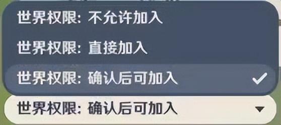 在操作界面左下角的“世界权限设置”中,旅行者可以设置当前世界的状态。有直接加入、确认加入、不允许加入三种可选设置。直接参与的设定意味着其他玩家可以直接进入旅行者的世界;确认后可以添加的设置需要其他玩家先申请,旅行者可以在一定时间内点击同意后其他玩家才能进入;不允许你加入的设置这绝对意味着旅行者的世界不会出现在其他玩家的世界列表中。