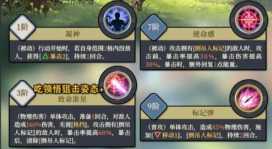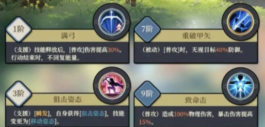 三技能:狙击姿态-3级、重甲破甲箭-7级、鹰眼-11级