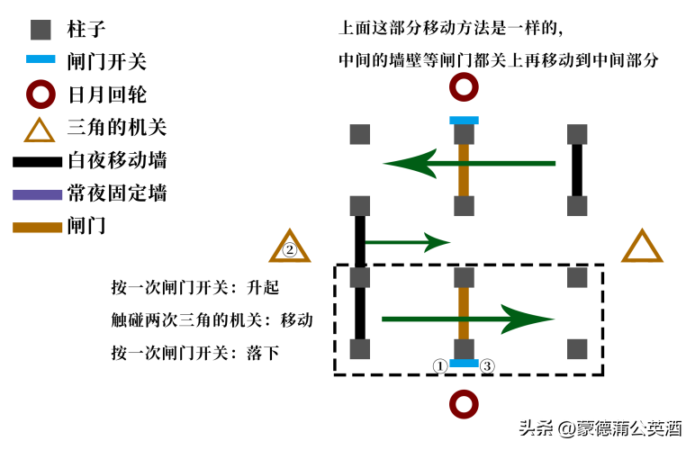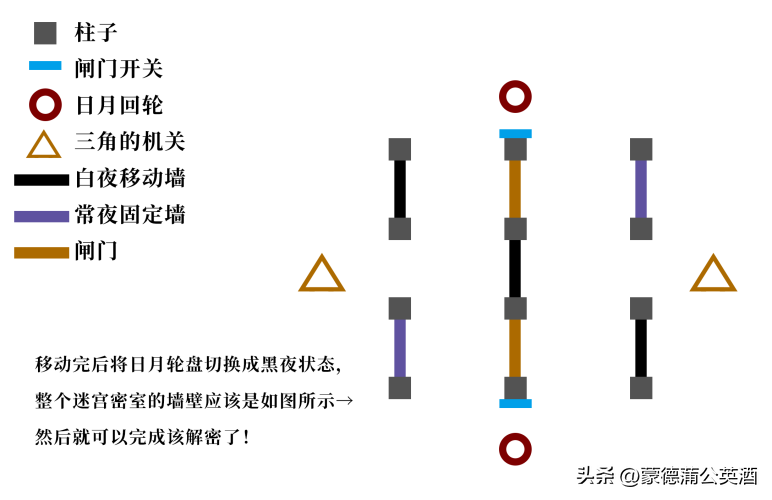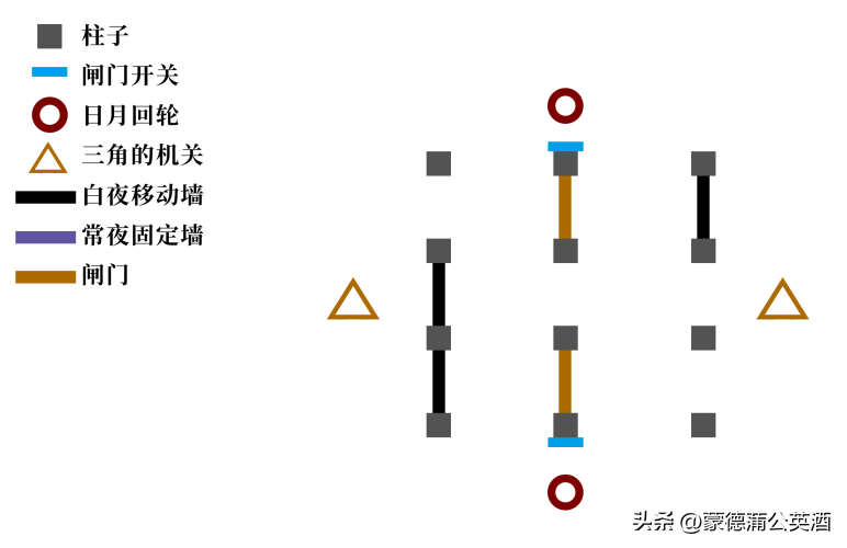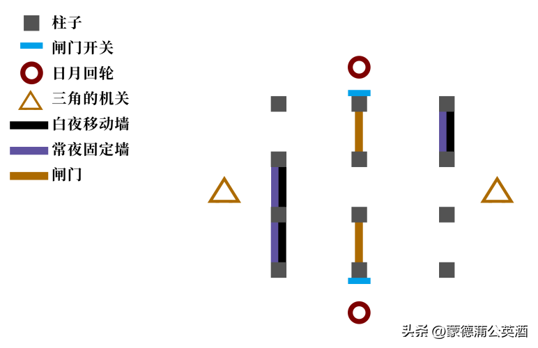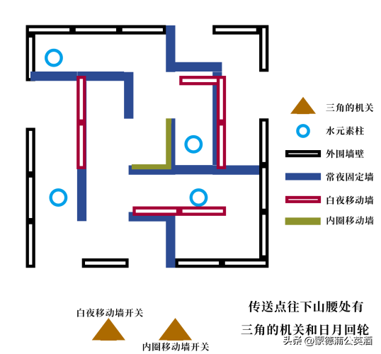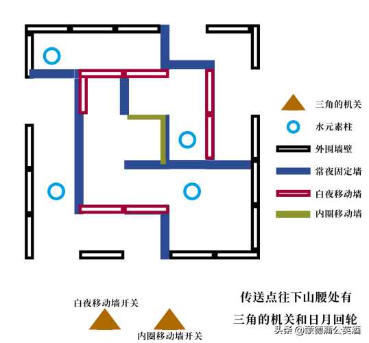 这个迷宫破解的关键点是:去迷宫内环移墙的地下室,但是要通过山腰的三角机制移动迷宫墙,需要解锁四根水元素柱子...为了方便理解,我在这里给大家画了一个简单的图: