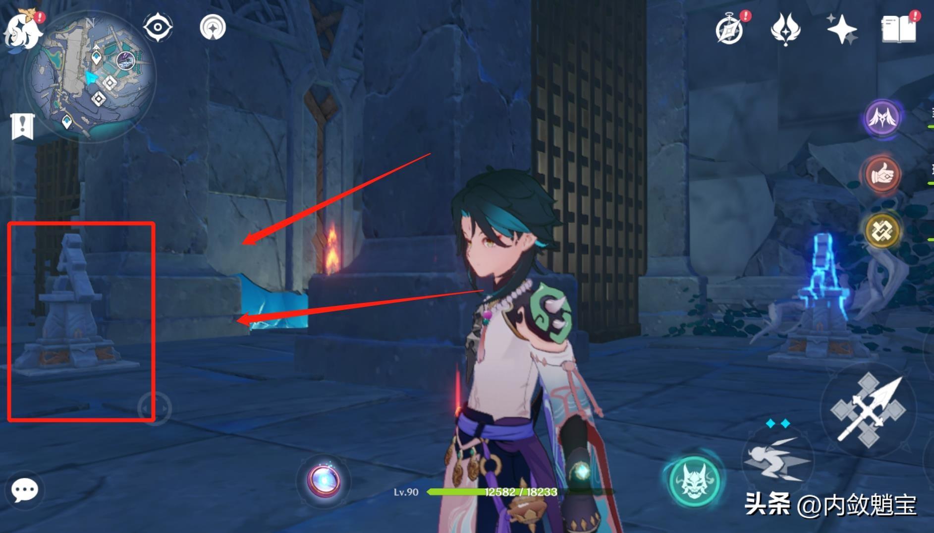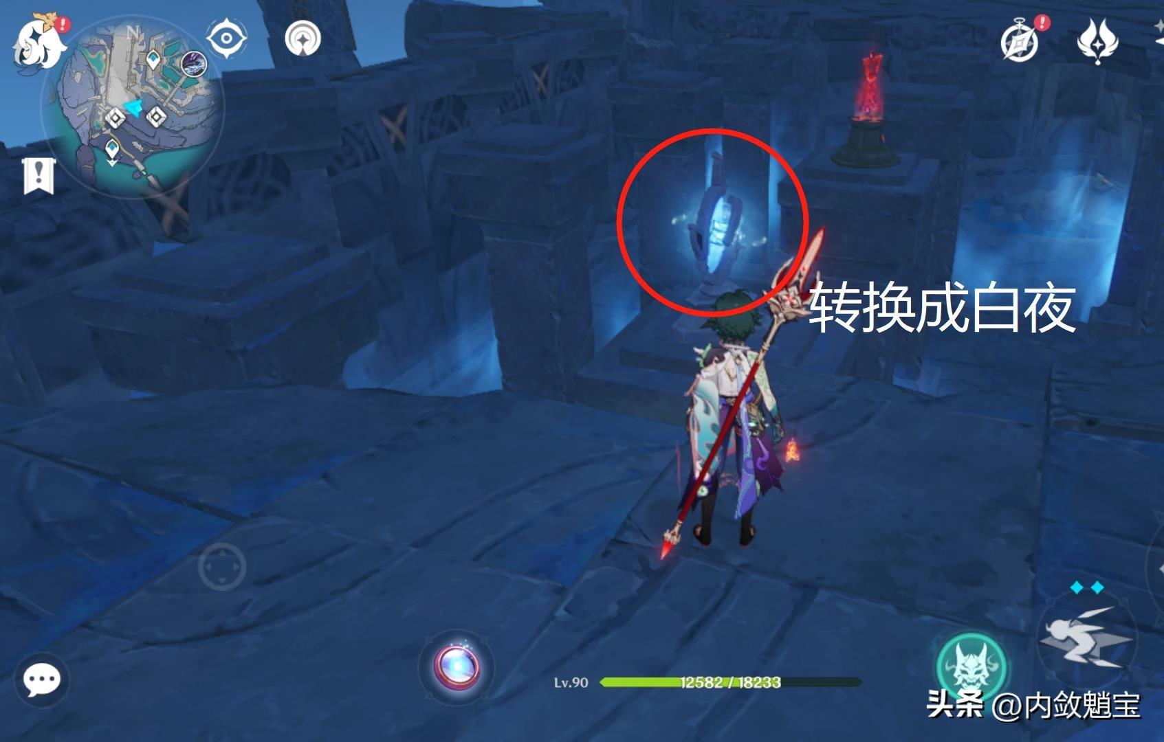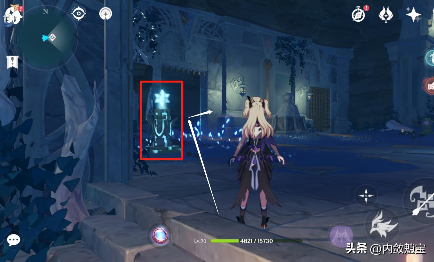 再次设置为正常夜晚(蓝色),返回洞穴,右转可以看到两个火把和一个宝箱。墙上有一个被激活的图案。