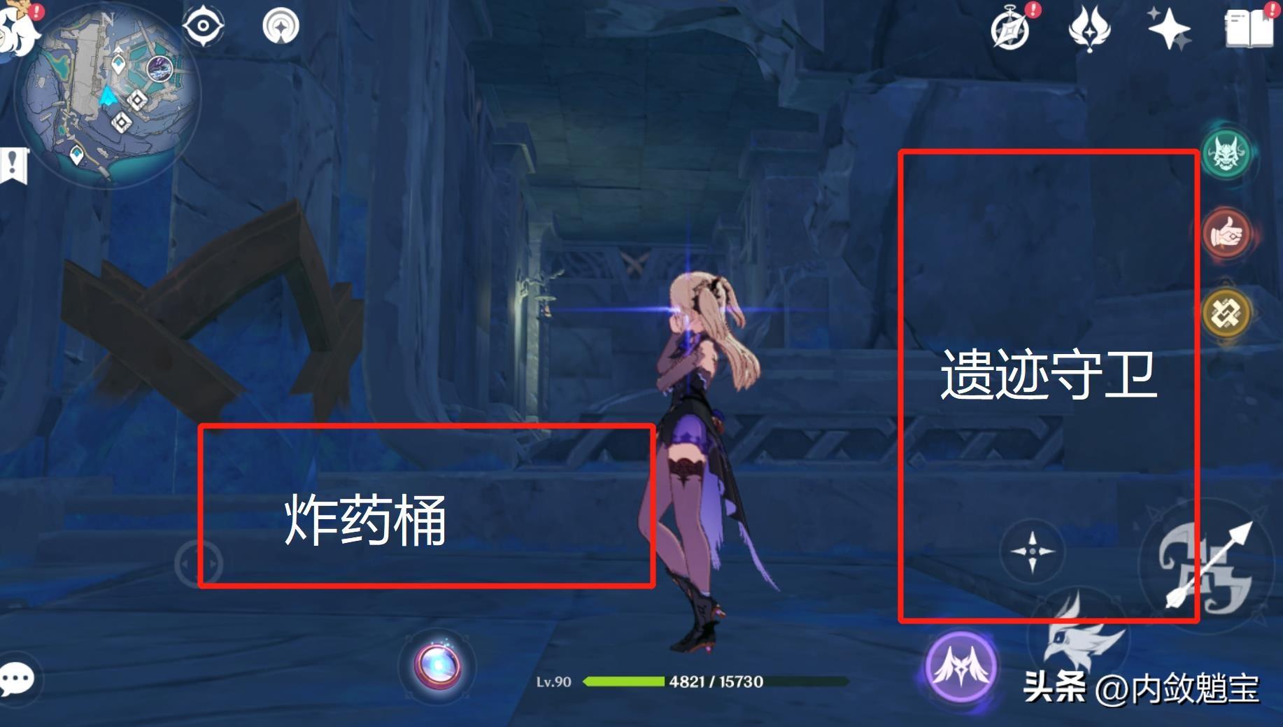 有废墟守卫和炸药桶。爆炸后,出现了一个洞。进入。