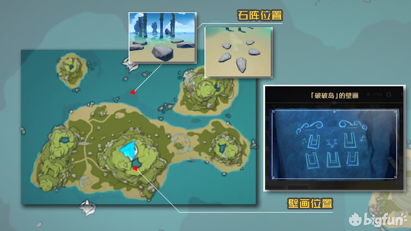 触发世界任务【雾与风之旅】后,我们会得知前辈们在金苹果群岛各处雕刻了壁画,其中之一就在破碎岛传送点所在的山上。这个任务并不是解决谜题的必要先决条件。只需找到壁画并了解线索即可。
