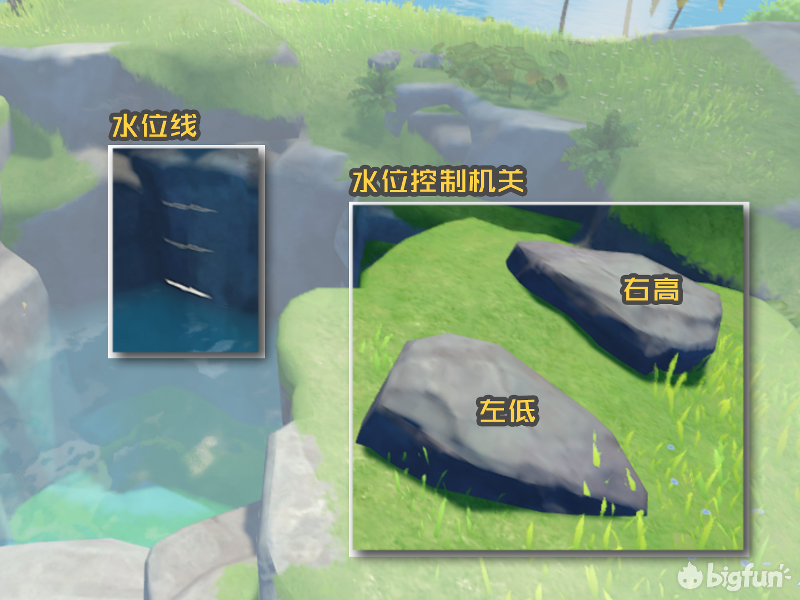 以C池为参考,可以看到水位有三个明显的水位。一侧的两个石夹是高水位和低水位的压力踏板。踩左边可以降低水位,踩右边可以提高水位。具体水位根据壁画和水池的位置而定。如果用数字3、2、1分别指代高、中、低,那么根据壁画所示的水位来选择2、3、1、2、1就不难理解了。