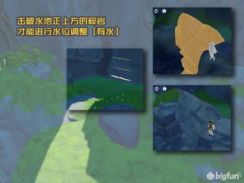 另外,E池需要将池正上方的碎石打碎,以疏通水流。水池获得水位后,可以通过压力踏板进行调节:
