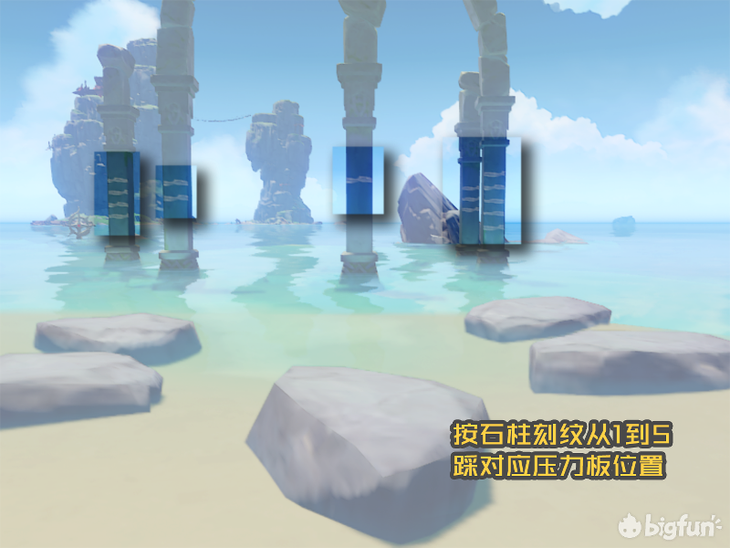 完成五个池塘的水位调整后,可以回到岸边的石阵,根据石柱上的刻线进行最后的调整(顺序为1到5,石子的位置)支柱对应压板的位置):