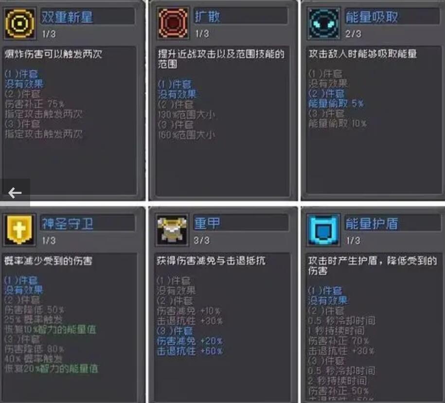 2件套:受到指定伤害时,伤害降低80%,并有40%概率触发恢复20点智力的能量。