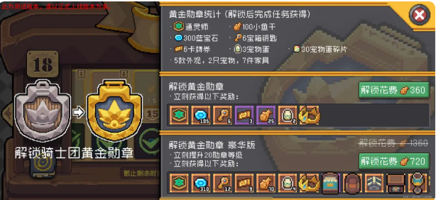 1.骑士勋章有两种:一种是免费的【骑士普通勋章】,另一种是需要付费的【骑士金质勋章】。