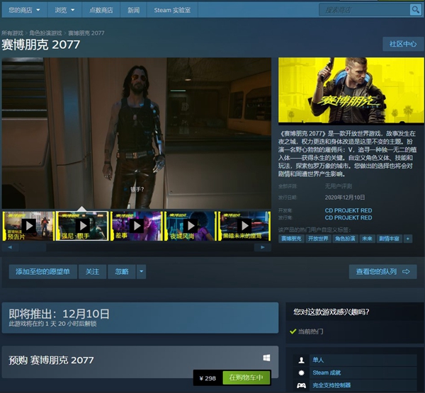 将于2020年12月10日在Steam平台发售,售价298元。