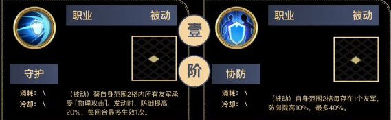 1、守护:代表自己2格内所有队友进行攻击,防御增加20%;